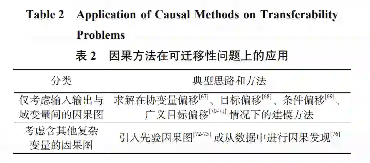 机器学习研究通常会在一个给定的训练数据集 上训练模型,然后在同数据分布的验证集或测试集 上进行测试,这种情况下模型的表现称为分布内泛 化(in-distribution generalization).在一般的应用场景中, 机器学习模型会部署在特定数据环境中,并使用该 环境中产生的数据进行模型训练,其性能表现可以用分布内泛化能力来度量.然而在一些场景中,目标 环境中的标注数据难以获取,因此更多的训练数据 只能由相似的替代环境提供.例如训练自动驾驶的智 能体时由于风险过高不能直接在真实道路上行驶收 集数据,而只能以模拟系统中所获取的数据为主进 行训练.这种场景下的机器学习任务又称为域适应 (domain adaptation),属于迁移学习(transfer learning) 的范畴,即将源域(source domain)中所学到知识迁移 至目标域(target domain).这里的域(domain)和环境 (environment)的含义相同,可以由产生数据的不同概 率分布来描述,下文将沿用文献中各自的习惯称呼, 不再对这 2 个概念进行区分. 在可迁移性问题中,因果理论的主要价值在于 提供了清晰的描述语言和分析工具,使研究者能够 更准确地判断可迁移和不可迁移的成分,有助于设 计针对不同场景的解决方案.因果推断中关注的效应 估计问题本质上是在研究改变特定环境作用机制而 保持其他机制不变的影响,这与迁移学习中域的改 变的假设相符,即目标域和源域相比继承了部分不 变的机制可以直接迁移,而剩余部分改变的机制则 需要进行适应.因此在因果理论的指导下,迁移学习 中的关键问题就是建模并识别变与不变的机制.目前 因果迁移学习一般假设输入 与输出 之间有直接 因果关系,重点关注无混杂因素情况下变量的因果 方向和不变机制,如表 2 所示,以下介绍相关工作