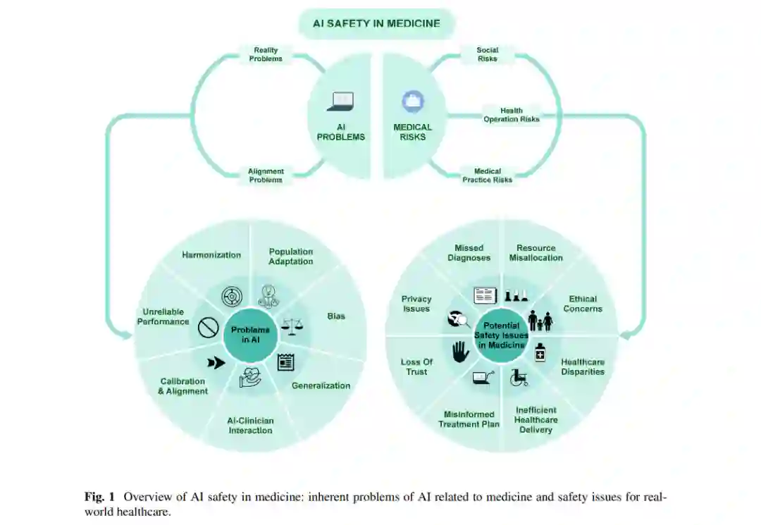 人工智能(AI)的最新进展为提高医疗效率和质量带来了重大机遇。仅在2023年,美国食品药品监督管理局(FDA)就批准了近700种AI驱动的设备,涵盖了放射学、眼科和血液学等多个医疗领域[1]。尽管取得了如此快速的进展,AI在医学中的成功应用仍然有限。最近的一项美国调查显示,60%的公众对医疗服务提供者依赖AI感到不安[2]。在患者、临床医生和公众中建立信任感至关重要,而确保安全是实现这一目标的关键。将AI系统应用于医疗中的安全挑战包括机器学习固有的科学问题、实施中的后勤障碍、采纳壁垒以及社会文化的变革需求。我们确定了两个关键领域,其中安全问题尤为突出:可靠性和一致性。AI可靠性的复杂性包括数据协调、性能一致性、校准、泛化、偏差与公平性、领域适应性以及AI与人类的交互[3, 4]。在本文中,AI的一致性指的是确保AI遵循人类定义的目标和原则,解决目标误指定和由患者或临床医生设定的奖励黑客问题。我们旨在通过首先讨论与医学风险相关的AI固有问题,然后探讨具体的医疗AI风险,最后总结大型语言模型(LLM)在医疗中的独特安全问题,来探讨AI在医学中的安全问题。
