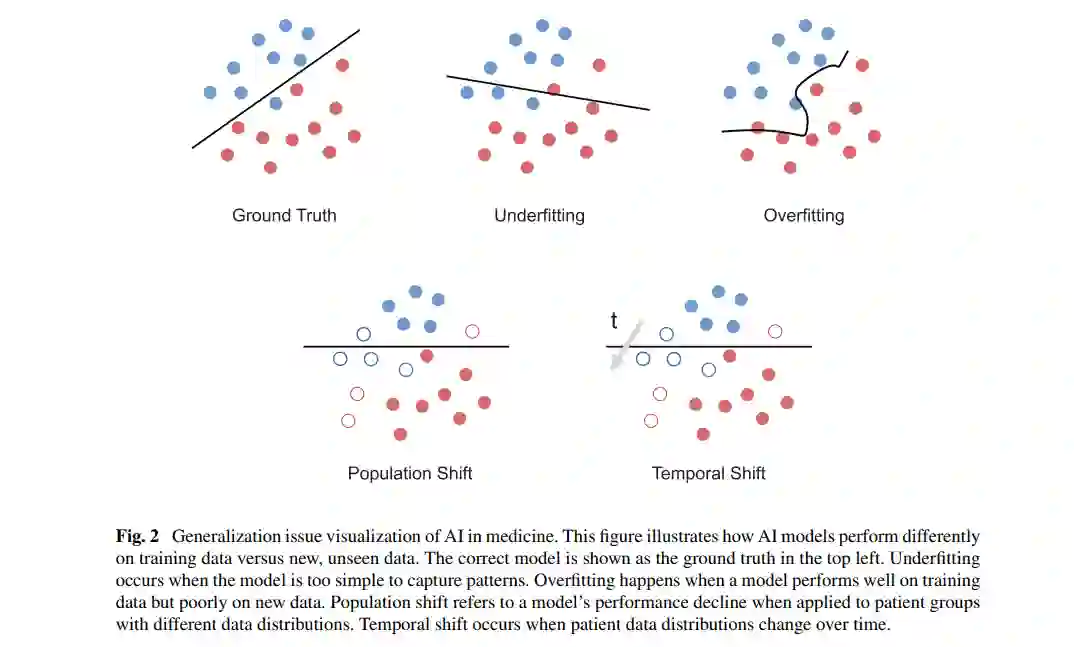 在医学实践中,建立能够被患者、临床医生和公众信赖的AI模型非常重要,因为医疗决策和结果的风险极高。然而,获得一个可靠的模型,即建立的模型应对潜在的干扰不变并始终根据不同的输入提供正确且准确的医疗指导,这在以下几个方面存在挑战,包括数据协调、模型校准、模型泛化和偏差。我们将在医疗环境中讨论这四个挑战。2.1.1 不同医疗提供者之间的数据协调数据协调挑战源于用于训练机器学习模型的数据的异质性。数据量的指数增长伴随着多样性的增加,这给数据管理和分析带来了巨大挑战。筛选这些异构数据的任务尤为复杂,影响了数据可视化和预测的过程,进而影响了分析结果。数据协调是一个至关重要的过程,旨在标准化不同形式的数据,尤其是在医学领域,以便进行统一的解释[5]。在医学机器学习领域,训练于有限数据集的模型缺乏泛化能力。当前的趋势倾向于使用来自多个医疗机构的大规模数据集,这使得多机构数据的协调变得不可或缺。数据协调通常是数据科学项目的初步步骤。如果协调不当,可能会引入错误,导致严重的医疗后果。无论规模大小,这些错误都会不可避免地改变特征值和分布,一些特征对这些扰动的容忍度较低。因此,将这些特征用于统计分析和模型构建可能会产生不可靠的结果,或掩盖真实的相关性,或错误地表明存在相关关系[6]。医学数据的协调在机器学习应用中面临几个重大挑战,包括:(1) 多样化的数据来源。医疗数据来自多个来源,如电子健康记录(EHR)、医学影像、基因组数据和可穿戴设备数据。它们独特的结构、格式和表示方式使得集成和共同分析变得困难[7-9]。(2) 不一致性和可变性:不同的医疗服务提供者可能会为相同类型的数据使用不同的术语、计量单位和编码方案,从而在数据集之间产生差异和不一致性。大多数数据已被证明对多个因素的跨机构变化高度敏感,包括设备制造商的差异、设备代次和型号、采集协议和重建设置的变化[6]。(3) 高维度性和复杂性:医学数据通常是高维的,涉及众多特征和变量。当不同类型的数据需要组合进行分析时,复杂性增加,需要复杂的方法来识别模式并做出预测[10]。(4) 标准化的缺乏:尽管医疗设备和行业中存在某些标准(如ISO),但在医疗文档和数据表示方面缺乏广泛认可和使用的全球标准,导致数据质量和结构的显著差异,给数据集成和随后的协调工作带来了困难[11, 12]。(5) 隐私和安全问题:医疗数据本质上是敏感的,其管理受严格的隐私和安全法规约束。这些法规虽然对于保护患者隐私是必要的,但通常限制了数据共享和合作的程度,从而限制了协调过程的范围[13-15]。(6) 偏差和代表性:数据收集方法和患者对医疗系统的访问存在差异,可能导致偏差或非代表性的数据集。这种数据集会影响机器学习模型的开发,进而对其泛化能力和可靠性产生负面影响[16, 17]。这些复杂性共同强调了创建适合开发可靠和有效的机器学习应用的连贯和全面的医学数据集的难度。2.1.2 针对不同患者的模型校准模型校准是医学AI中的另一个主要挑战。机器学习中的模型校准是一个关键过程,确保预测结果的概率与该结果的实际发生率高度一致。例如,如果一个校准的模型预测某事件的发生概率为80%,那么在大规模患者群体中,该事件应大约80%的时间发生。校准的主要挑战在于医学领域中AI预测置信度水平的正确解释和应用。首先,缺乏标准化的校准基准,目前没有公认的指导方针用于医学中的AI模型校准。这导致了模型可靠性水平的差异,并使跨医疗机构的性能评估变得复杂。其次,在医学环境中,置信度水平的误解很常见。临床医生可能会过度依赖置信度高的AI预测,削弱临床判断,或由于缺乏信任或理解而未能充分利用有价值的预测,尤其是在模型提供中等但具有临床意义的预测时。最后,随着医疗知识和实践的不断发展,保持AI模型的校准具有挑战性,这需要持续更新和重新校准,以确保新疗法和诊断技术的准确性。2.1.3 针对不同患者群体的泛化能力机器学习中的“泛化”指的是模型在训练后能够对未见过的数据表现良好的能力。对于医学AI应用,过拟合、欠拟合、人口转移以及时间变化是泛化能力常见的问题。2.1.4 针对不同患者群体的偏差机器学习模型在医学中的偏差问题是一个重要的关注点,因为它会影响医疗决策的可靠性和公平性,可能导致不同人群亚组的医疗不平等。2.1.5 适应新患者群体的困难将机器学习模型微调至本地数据是适应新患者群体和医疗环境的关键,但这也带来了挑战,影响了模型的有效性和泛化能力。