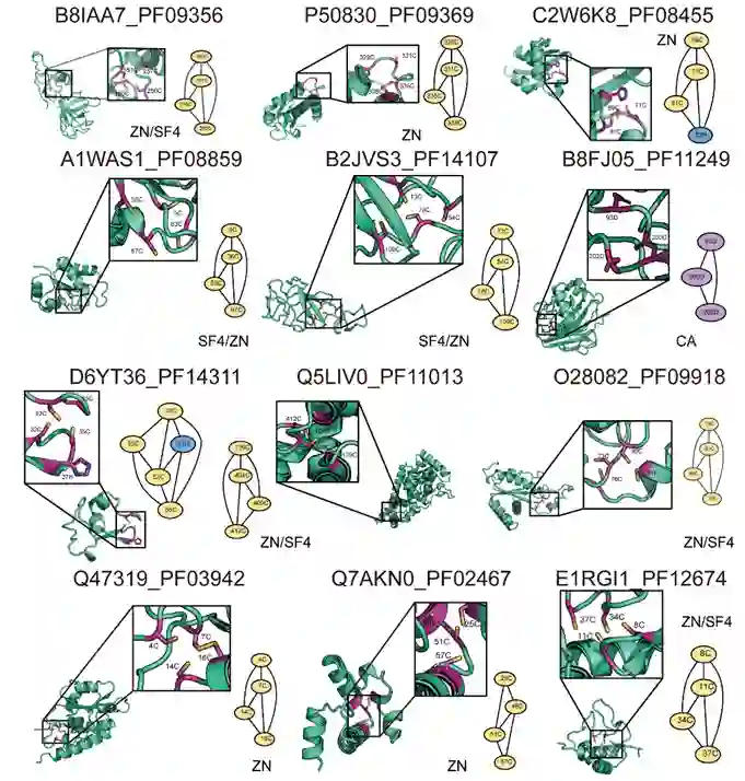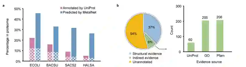 **作者将该预测方法命名为MetalNet,并将该方法首先对包括两种细菌与两种古细菌的原核物种蛋白质组进行预测。在这四种代表性原核物种中,MetalNet总共预测得到4849个可能的金属结合蛋白,这些预测的潜在金属结合蛋白中接近一半可以被同源蛋白中的结构直接支持或从其他蛋白质数据库中获得间接支持。**接下来,作者利用宏基因组测序数据得到的共进化信号,对Pfam蛋白质家族数据库中此前缺少结构的蛋白质家族进行了预测。MetalNet在1116个家族代表性蛋白中预测到175个具有共进化残基网络簇的金属结合蛋白。