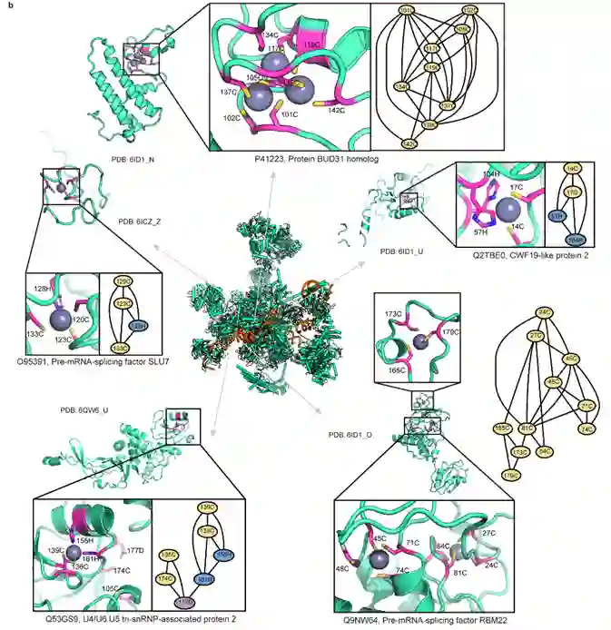 最后,作者将MetalNet应用于人剪接体蛋白质组的预测,发现目前已经解析的剪接体蛋白结构中报道的所有已知锌离子结合位点都可以被捕获,展示了MetalNet预测真核蛋白金属结合位点的潜力。 综上,作者结合蛋白质残基共进化和机器学习算法开发了MetalNet的计算方法,能够在蛋白质组学层面系统地预测蛋白质上的金属结合位点。总的来说,**该方法只需要将 MSA 衍生的共进化信息作为输入,而不依赖于任何序列或结构基序来进行预测。**本文的共同通讯作者包括北京大学化学与分子工程学院、北大-清华生命联合中心、北京大学合成与功能生物分子中心的王初教授,北京大学生命科学学院、蛋白质与植物基因研究国家重点实验室、北京大学生物医学前沿创新中心的苏晓东教授,以及王初课题组的刘源副研究员。北京大学化学与分子工程学院2017级博士研究生程瑶、2018届博士毕业生王浩博、北京大学生命科学学院2022届博士毕业生徐华和王初课题组的刘源副研究员为本文的共同第一作者。王初课题组的马斌、陈学敏、曾欣和王相贺等合作者为本课题做出了贡献。该工作得到了国家自然科学基金委的经费支持。