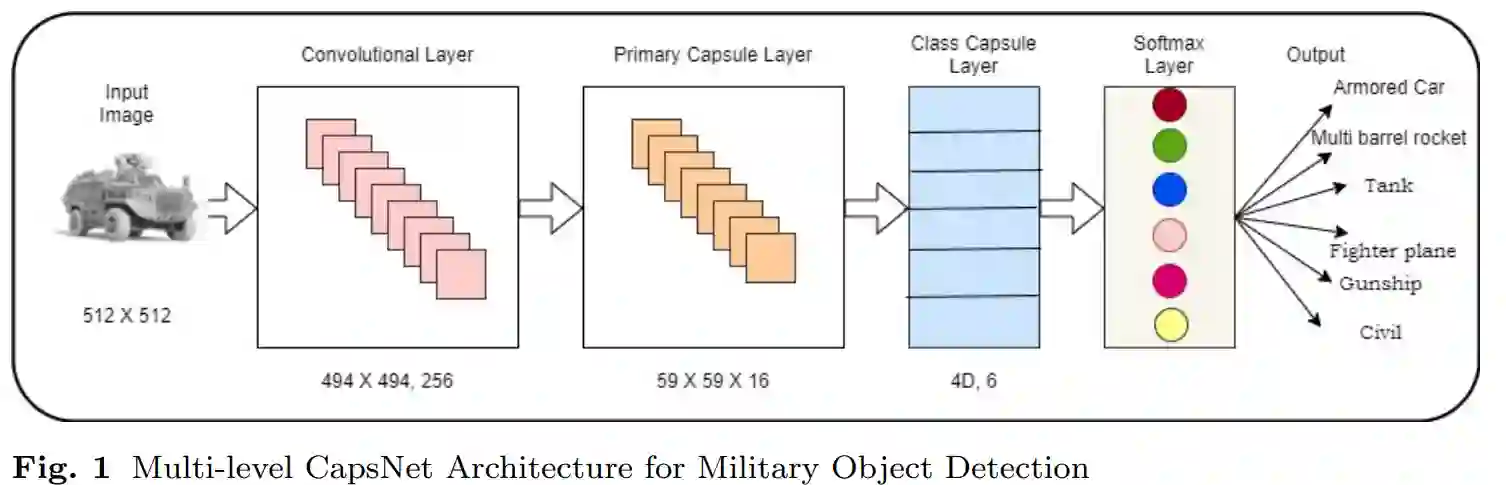 由于对数据进行分类的军事准则,国内外在这一领域所做的有效调查很少。通过对最近所做的工作进行分析,我们发现,需要为军事目标检测任务设计有效的方法或系统。为了提高战争中使用的武器和车辆的生存能力,它们将在非战争时期进行伪装。因此,伪装,加上令人困惑和可改变的战区,确实使识别军事目标变得更加困难。考虑到军事目标识别任务的质量和先决条件,本文通过对人类视觉感知策略的模仿,提出了一种检测军事目标的方法。本文的工作探讨了以下几个部分:a)介绍一种基于深度学习的胶囊网络(CapsNet)的新方法,用于检测给定图像中的军事目标;b)收集一个包括足够数量的军事目标的数据集,以验证所提出的方法。