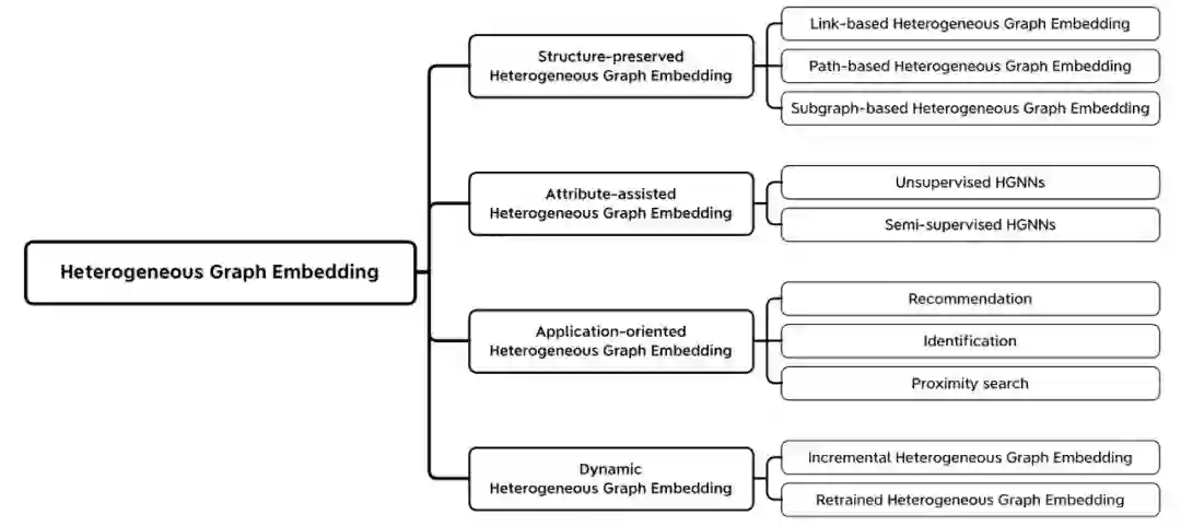 结构保持的异质图嵌入:主要集中于捕捉和保持异质的结构和语义,如元路径和元图。 信息辅助的异质图嵌入:在嵌入过程中加入了更多的非结构信息,如节点或者边属性,从而更有效地利用邻域信息。 应用导向的异质图嵌入:进一步探讨了异构图嵌入方法的应用(即在异质图上学习面向特定应用的节点嵌入)。 动态异质图嵌入:捕捉异质图的演化过程,并在节点嵌入中保留时序信息。