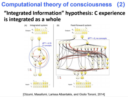 再来看 Integrated information hypothesis,当信息整个集合的时候,整合起来的信息量大于单个个体。如果有系统可以产生这样的信息量以及信息的集成,也就是刚才所讲在整个大脑里面信息量得到了整合。同时也就摒弃了一切争论。确定的一点是,只有在信息整合充分的情况下大脑单元中才有主观意识。