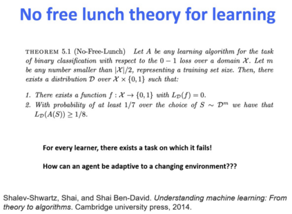 既然这样,我们如何让智能体拥有一个很好的学习方法?它能够非常适应周围环境,尤其是不断变化的环境。这点对人和机器学习都非常重要。由于机器学习讲究的是泛化性,如果无法泛化到一个以前没有见过的环境,它的学习能力显然也是有限制的。