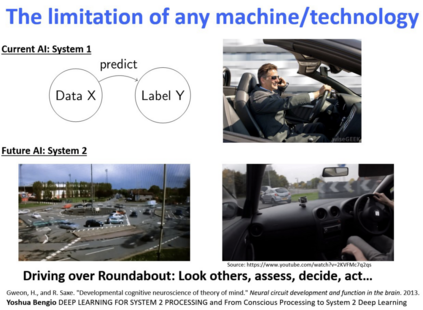 回过头看,**对于复杂的任务,现在的机器学习方法还未能达到解决的地步。**比如自动驾驶,你可以将它归结为当前 AI 系统还不能像人一样观察环境、根据当前情况进行判断、做决策和执行。