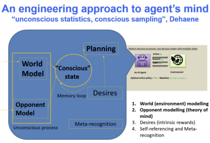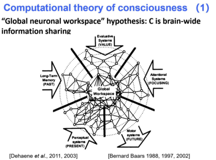 那么,是不是在计算机或人工智能领域完全没有这样的工作呢?回答是否定的。其实在研究人工智能的过程中已经有一些工作展开了,比如 global workspace,它甚至都谈不上一个数学模型,而只是一个对人产生意识的框架或理论。我们作为计算机科学家的主要任务是假设模型是对的,但如何去将它计算机化?这是主要矛盾。