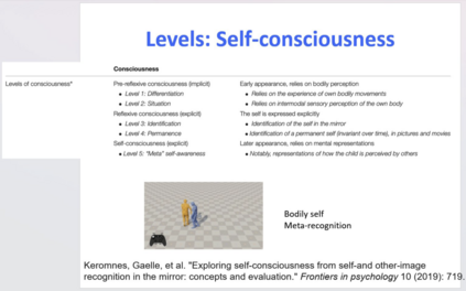 同样地,在强化学习中,我们可以有对具身的建模。但这些其实并不足够,我们可能需要发明一个新的框架,比如反馈回路、自具身世界建模、对手建模和 Meta-recognition。所谓 Meta-recognition,即强化学习知道它自己在做强化,自己反思这些行为,并在 Meta 层次看能不能识别。这些到最后是不是就能产生自我参照(Self-reference),并产生自我的概念呢?我们在这一方面做了很多尝试。