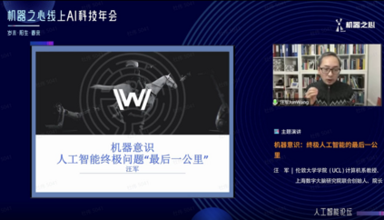 转载机器之心机器之心编辑部1 月 11 日,在机器之心 AI 科技年会上,伦敦大学学院(UCL)计算机系教授、上海数字大脑研究院联合创始人、院长汪军发表主题演讲《机器意识人工智能终极问题 “最后一公里”》。在演讲中,他主要介绍了机器学习和深度学习的当前现状、解决方案以及未来发展。