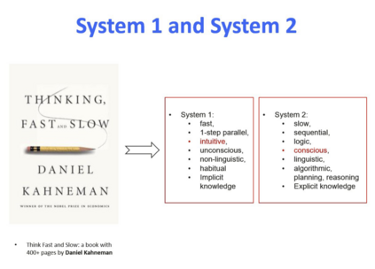 你会发现,在做决策的时候有两个阶段都可以包括在内。所以,一些神经科学家包括研究深度学习的科学家提出了 System 1 和 System 2 的概念。我们有慢思考(slowthinking)和快思考(fastthinking),慢思考是比较有主观意识的,可以进行规划、推理等。System 1 是应激性的、非常快的,同时是没有主观意识的。虽然可以解决一些问题,但无法解决所有问题。