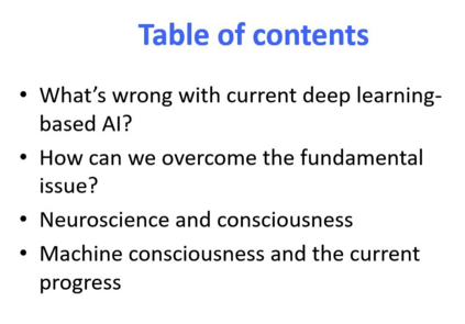 演讲内容主要包括如下几个方面。首先是讲当前深度学习为基础的 AI 有哪些短处?当然大家都在讲它的好处,包括大模型等,但我想从当前存在问题的角度来阐述。接着是如何解决这些根本性问题?我在思考从脑科学以及人的意识、对人脑的研究这些方面会不会给我们带来不一样的东西。最后介绍一些当前机器意识的研究,包括目前的进展和未来的方向等。