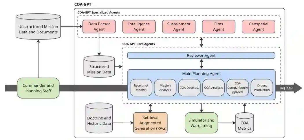 在规划过程的任何时刻,指挥控制参谋都可以在批准前检查并/或细化生成的军事决策流程产物,确保决策权和军事判断力保留在人类手中。此外,我们的系统由LLM驱动的一个关键优势是,规划参谋或指挥官可以直接指导或向COA-GPT下达指南,系统将根据该反馈细化其输出。COA-GPT的多智能体架构允许规划参谋直接与多个专用LLM和外部工具交互以执行军事决策流程。这种代理式设计镜像了人类军事参谋的结构,由专业参谋处理军事决策流程的不同方面。除了其规划能力,COA-GPT还作为一个全面的数据管理系统,适用于所有任务和条令文档,因为它转换非结构化数据并构建一个包含所有相关规划信息的结构化数据库。COA-GPT还维护一个规划通用作战图(COP)以展示其产物,管理战场条件和资源可用性的运行评估,并生成任务执行所需的最终战斗产物。这种集成方法使所有规划要素在整个军事决策流程中保持一致,为指挥官和参谋提供最新的决策信息,并通过使用陆军已在更高层级采用的相同流程来加速规划。