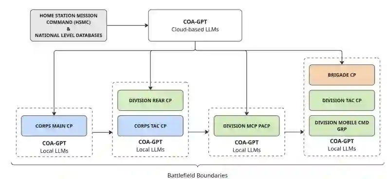 相反,部署在战场内的指挥层级则在通信拒止、降级、间歇与受限(DDIL)的假设下运作。对于这些单位(包括从军到旅级的各种指挥所(CP)),连接云端的可靠性无法保证,甚至由于电磁(EM)辐射担忧而不被期望。因此,这些层级配备了运行在自包含本地LLM上的COA-GPT实例。这一关键设计选择确保了每个指挥所都拥有有韧性的、独立的人工智能助手,在规划与决策支持方面保持完全功能,不受连接性影响。