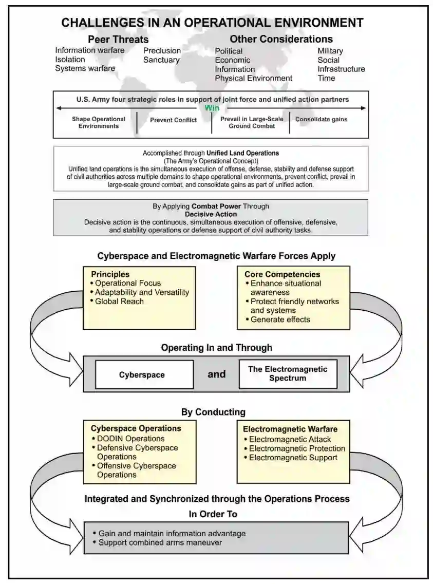 FM 3-12 描述了执行赛博空间电磁活动的人员如何整合和同步赛博空间作战和电磁战功能和跨作战职能的能力,保卫网络,并在统一地面作战期间为各级指挥官提供关键能力。