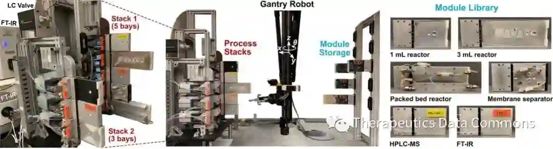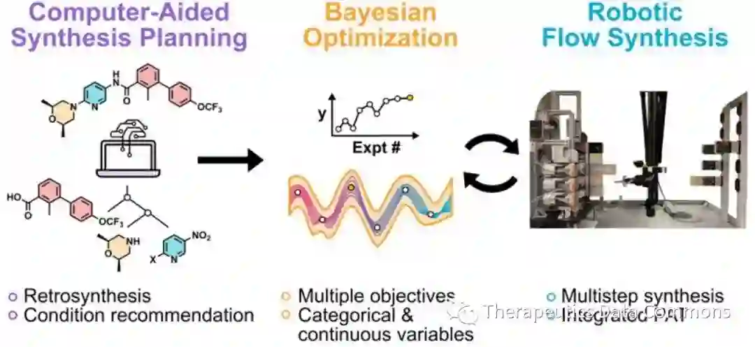 近年来,机器学习辅助的药物发现展现出了巨大的应用潜力,虚拟筛选所发现的大量新颖的小分子结构有望为诸多疾病的治疗提供新的解决方案。但是目前许多由算法所设计的药物分子由于资源有限以及结构特殊等原因短时间内难以被合成,进而阻碍了对其效果的进一步验证。自动化技术早在上世纪就用于组合化学以及高通量药物发现等研究,随着计算机辅助的合成路线设计(Computer-aided synthesis planning,CASP)的不断成熟,人们开始认识到可以结合自动化实现结构更为复杂的分子的化学合成,利用其高效与可控性进一步加速药物发现。Jensen课题组曾于2019年报道了基于流动化学的自动化合成平台[2],在本文中作者利用这一平台对计算机提出的合成路线进行了验证与优化,展示了将自动化、机器学习以及机器人等技术的综合应用在加速合成与发现的应用潜力。