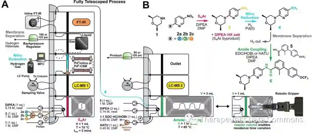 图 2执行合成的自动化平台 整个合成优化过程的示意图如图3所示。第一步反应为1与2之间的SAr反应,该反应可以通过在线LC/MS直接进行监测;随后硝基的还原反应在填充有Pd催化剂的流动床反应器中进行,由于第一步反应的产物可能会对催化剂的效果产生影响,他们首先对固相催化剂的形态进行了筛选优化,并最终选取了3D打印的静态混合器作为流动床的填料。反应结束后,通过膜分离器将气体与液体进行分离,所得产物4直接用于与5的缩合反应,最后的总产率通过LC/MS进行监测分析。LC/MS以及FTIR等在线分析模块的引入对分析反应变量对产率的影响起到了至关重要的作用。
