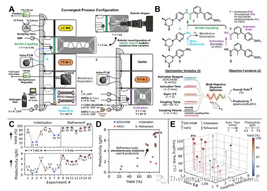 图 5 对后续反应的优化。(A)仪器示意图,(B)需要优化的参数,(C-E)优化结果 随后,作者对后续两步反应进行了优化(图5),包括了硝基还原、液气分离以及酰胺缩合。他们发现如果在最后一步的缩合反应中如果同时加入HATU与4,那么会有明显的副产物产生,为了解决这一问题,需要首先将HATU与羧酸5混合进行活化。为此,他们充分利用了该流动平台灵活性的特点,在还原硝基的同时活化5,并运用FT-IR对反应进行监测,在该流程中对5个变量(活化试剂的种类,活化时间,3的当量,缩合温度以及时间)进行优化,并以产率与产能作为优化目标。在13小时内,该平台总共进行了15次实验,算法最终选择了HATU作为缩合试剂,成功地将产能由最初的1.6 g/h提升至7.4g/h。