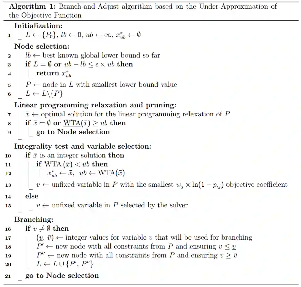 本文在以下方面对文献有所贡献。鉴于 WTA 问题是一个非线性整数优化问题,本文简要介绍了如何应用现有的几种方法将该问题线性化,并比较了它们的优缺点。最重要的是,本文进一步开发了一种专门的精确算法,仅使用非线性目标函数的紧凑凸下逼近来解决 WTA 问题。该算法的主要创新思想是使用 WTA 目标函数的紧凑片面线性下近似值来寻找下界和引导分支,同时在分支-约束框架中求助于非线性 WTA 目标的精确值来进行约束。因此,只需在现任节点上对目标函数进行简单的手动调整,就能在任何分支与边界算法的基础上构建该算法。因此,该算法更准确的名称应该是 "分支-调整-约束",为简洁起见,我们将其简化为 "分支-调整"。所提出的求解方法可以使用最先进的混合整数线性优化软件来实现,并能处理非常大规模的 WTA 问题实例。当它不能在规定的时间内将问题实例求解到最优时,它提供了一个非常合理的最优保证,即在获得的最佳解上有一个很小的最优差距。据报道,Lu 和 Chen(2021 年)的求解方法可处理多达 400 种武器和 400 个目标的问题实例,与之相比,我们实验中提出的算法可在几分钟的计算机时间内将多达 400 种武器和 800 个目标的实例求解到最优,并在两小时的计算机时间内将更大的实例求解到差距很小的次最优。此外,所提出的求解方法具有通用性,可成功应用于 WTA 以外的其他应用领域。