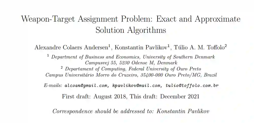 Metler 等人(1990 年)提出了一套求解算法,使用启发式算法将问题分解为两个阶段的子问题分别求解。随后,Ahuja 等人(2007 年)提出了几种下界方案作为构造启发式算法,并通过大规模邻域搜索加以改进。针对 WTA 问题还提出了其他各种启发式求解算法,参见 Sonuc 等人(2017 年)及其中的参考文献。最近,Lu 和 Chen(2021)提出了一种基于列生成思想的 WTA 问题精确解算法。关于武器目标分配模型和求解算法的全面综述可参见 Kline 等人(2019)。