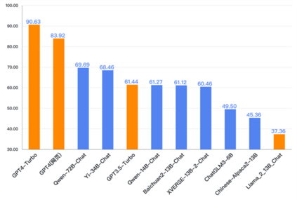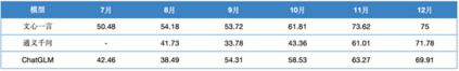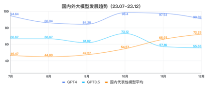 数据来源于SuperCLUE基准得分(7月-12月) 我们可以看到GPT3.5和GPT4在中文上的表现情况基本一致,在11月份测评结果中显示,在中文能力都有一定的下滑,而国内头部模型则展现了继续稳健提升的能力。在12月份的测评结果中可以看到,国内第一梯队模型与GPT4的差距在缩小。但仍有较大的距离需要追赶。