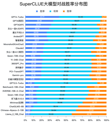 来源:SuperCLUE 曾经取得过SuperCLUE月榜首位的大模型有6个。分别是文心一言、BlueLM、SenseChat3.0、Baichuan2-13B-Chat、360智脑。其中,百度的文心一言登顶SuperCLUE月榜的次数最多,分别在7月、11月、12月取得了SuperCLUE最好成绩。 我们可以看到,在国内大模型技术发展初期阶段,各家大模型公司都投入了巨大的人力、算力和数据资源,以至于每个月测评结果的前三甲都不同程度的变化,经常会因为新发布的高质量模型引起榜单的变化。预计未来一年同样会发生类似的情况。也非常期待有高质量模型能够持续保持非常高的水准。 6. 大模型对战胜率分布图 从胜率来看,全球领跑者GPT4-Turbo胜率为41.77%,和率为52.46%,大幅领先于其他模型,而败率仅为5.77%,足以说明GPT4-Turbo对GPT3.5在各项能力上的全面压倒性优势。而国内模型中,百度的文心一言4.0胜率国内最高,接近30%。胜率超过25%的模型有智谱清言、通义千问2.0和AndesGPT。