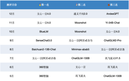 5. 国内大模型历月前三甲 过去八个月国内模型在SuperCLUE基准上的前三名。