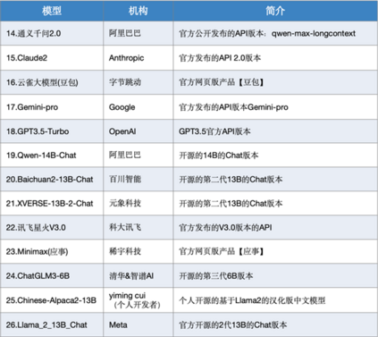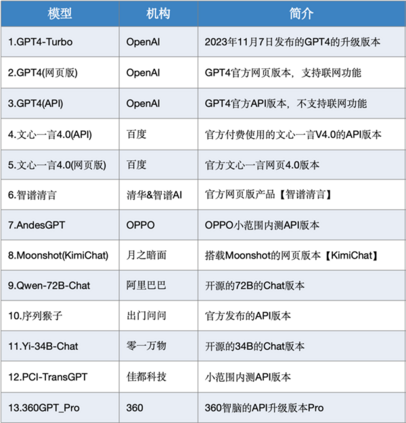 数据来源于SuperCLUE基准得分(7月-12月) 说明: 趋势展示,选取了7月-12月SuperCLUE-OPEN测评分数。国内代表性模型,选取了文心一言、通义千问、ChatGLM。原因是综合考虑了过去半年SuperCLUE测评结果、长期稳定迭代及对国内大模型生态的贡献;GPT4成绩,由GPT4-API(7-9月)与GPT4-Turbo(10-12月)组成,用以表现国外最好模型发展。 大模型综合测评结果 1. 测评模型列表 本次测评数据选取了SuperCLUE-12月测评结果,模型选取了国内外有代表性的26个大模型在12月份的版本。