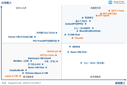 2. SuperCLUE模型象限 SuperCLUE评测任务可划分为基础能力和应用能力两个维度。 基础能力,包含:专业与技能、语言与知识(不包括角色扮演)、传统安全; 应用能力,包括:工具使用、角色扮演。 基于此,SuperCLUE构建了大模型四个象限,它们代表大模型所处的不同阶段与定位,其中【潜力探索者】代表模型正在技术探索阶段拥有较大潜力;【技术领跑者】代表模型聚焦基础技术研究;【实用主义者】代表模型在场景应用上处于领先定位;【卓越领导者】代表模型在基础和场景应用上处于领先位置,引领国内大模型发展。 SuperCLUE模型象限