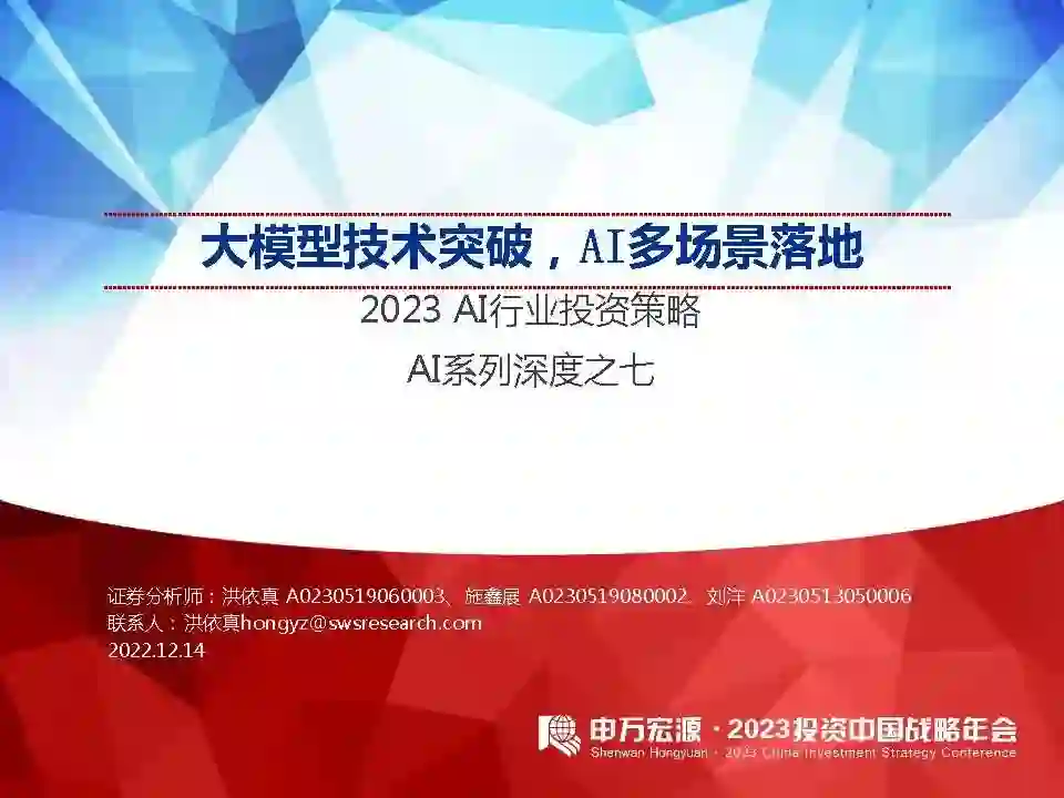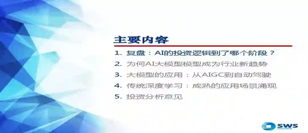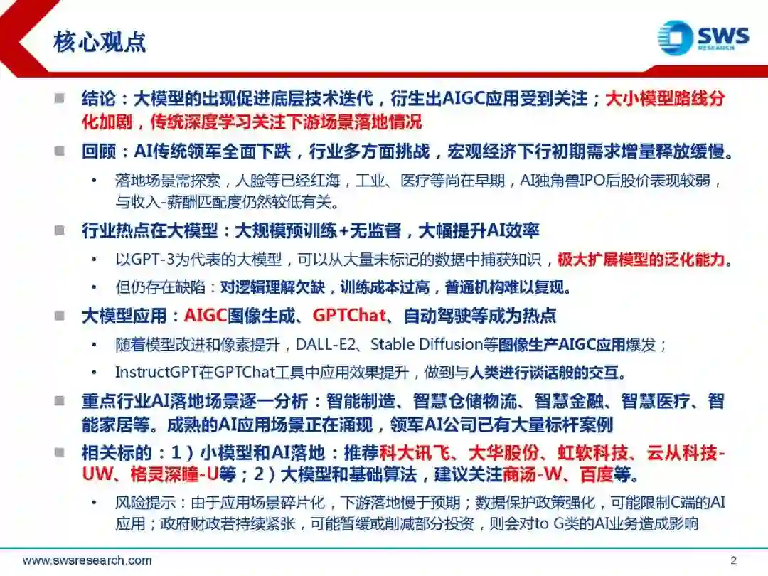 结论:大模型的出现促进底层技术迭代,衍生出AIGC应用受到关注;大小模型路线分化加剧,传统深度学习关注下游场景落地情况