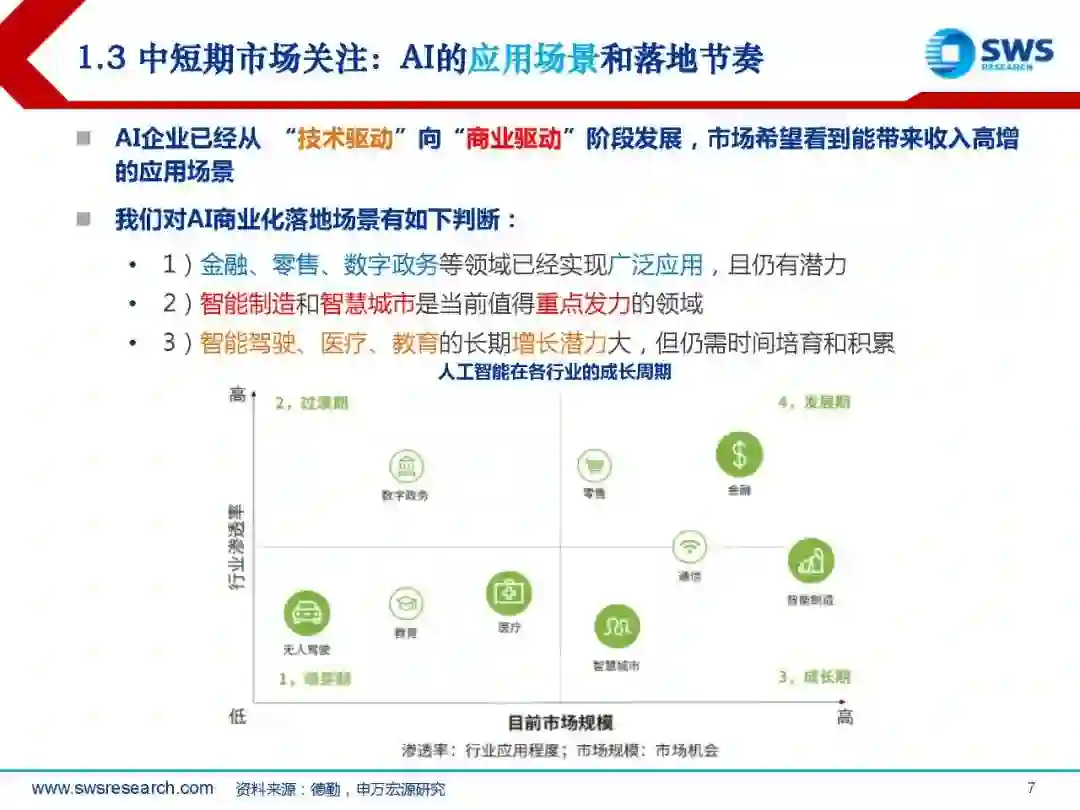 重点行业AI落地场景逐一分析:智能制造、智慧仓储物流、智慧金融、智慧医疗、智能家居等。成熟的AI应用场景正在涌现,领军AI公司已有大量标杆案例