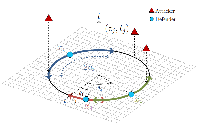 一般来说,周界防御问题的解决方案是为一组限制在某一区域周界的智能体寻找策略,这些智能体受托保卫该区域不受试图突破该区域周界的入侵者侵害[16]。