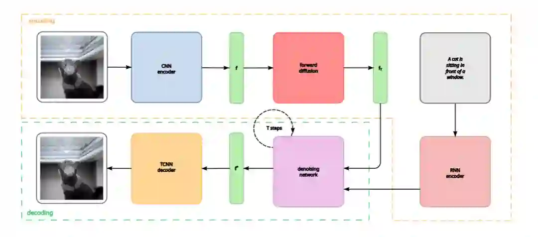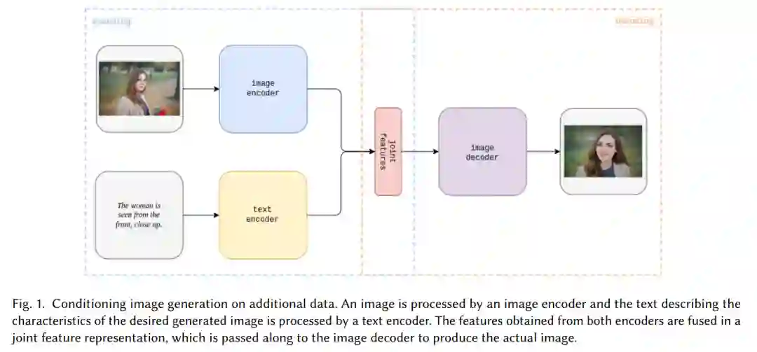 自2012年ImageNet大规模视觉识别挑战(ILSVRC)以来,当AlexNet [70] 显著超越了所有先前方法后,深度学习成为了图像分类的事实标准,因为它能够比其他方法实现显著更高的准确度。卷积神经网络(CNNs)已成为视觉领域进步的主要动力,首先是使用反向传播 [74] 的基本形式,随后引入了残差连接 [46]。这被自然语言处理(NLP)领域的进步所仿效,后者依赖于循环神经网络(RNNs),其中长短期记忆(LSTM)[53] 架构成为一种特别成功的方法。随后,注意力机制 [7] 的设计导致了基于注意力的架构,如Transformer [148],以及针对Transformers的预训练(BERT)[29]。Transformer架构的进步已进入视觉领域,表现在Vision Transformer(ViT)[33]的设计上。 CNN/ViT在视觉领域和RNN在NLP领域的方法共同依赖于分类任务。这在视觉领域更为明显,其中手头的问题通常本身就是分类任务。NLP架构可能以更隐性的方式使用分类,例如在机器翻译中,问题形式可允许多步骤分类作为可行的任务形式。 然而,必须指出,基于分类的问题并不是深度学习取得显著进步的唯一领域。新技术成功引入的一个广泛研究领域是生成模型领域。使用编码器/解码器架构 [1] 的想法为生成建模找到了新的相关性,随着变分自编码器(VAEs)[67] 和生成对抗网络(GANs)[42] 的出现,以及后来的扩散模型 [134]。这些模型最初有限的能力被扩展,例如通过引入稳定GAN训练的措施,形成了DCGAN模型 [113]。随后进行了更多扩展基本方法的工作。对于VAEs的显著例子包括量化的VAE(VQ-VAE)[147] 及其第二代 [117]。对于GANs,通过像StackGAN [168] 及其扩展 [169] 这样的模型进行了改进。在扩散方面,通过去噪扩散概率模型(DDPMs)[50],[104],[30] 的出现取得了进展。 聚焦于VAEs、GANs和扩散,所有这些方法都依赖于随机输入作为数据生成过程的种子。这种随机性是生成样本多样性的来源。也已经实验性地显示,输入可能还携带了关于生成样本的某种语义信息。对于视觉而言,这可能意味着输入到系统中的随机数据决定了在生成图像中可见的选定特征 [113],而这些特征可能与人类对描述性属性的理解相关联。 这不仅适用于随机输入,还适用于提供给架构的特定定制信息。原则上,VAEs、GANs和扩散模型并不严格要求所有输入数据都是随机的,因此可以向模型展示额外信息。在这种情况下,生成过程取决于输入数据,架构可以被认为是条件生成模型。条件信息的确切形式可能有所不同。在相对简单的设置中,它可能是我们希望生成的实例所属类的标签。然而,情况可能并不那么简单。 如果我们考虑条件信息编码了所需生成图像的一部分特征,那么就有可能使用由单独训练的模型或联合训练架构的上游部分提取的实际特征。一个相关的例子可能是使用CNN或ViT特征提取器(图像编码器)处理输入图像,并得到这个图像的特征表示。然后,这个表示可以输入到基于VAE、GAN或扩散的模型中。原则上,这个过程可以针对多个数据源重复进行,无论是否包括随机数据。一个具体的例子可能涉及图像编辑任务,其中输入图像由CNN/ViT图像编码器处理,所需最终图像的文本描述由RNN文本编码器处理。然后将这些表示融合为一个,传递给转置卷积(TCNN)[35] 图像解码器、Transformer图像解码器 [148],可能以自回归方式 [146],或扩散图像解码器 [134] 来生成与输入图像特征相符但符合提供描述的图像。这一过程的概述可见于图1。