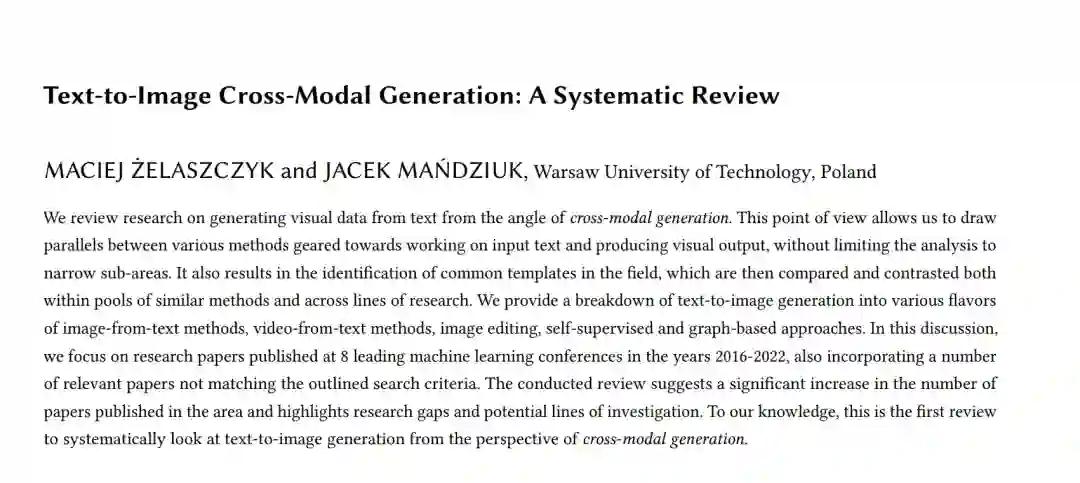 我们从跨模态生成的角度回顾了从文本生成视觉数据的研究。这种观点让我们能够在不将分析局限于狭窄的子领域的情况下,对各种旨在处理输入文本并产生视觉输出的方法进行比较。这也导致了在该领域内识别出共同的模板,这些模板随后在类似方法池中以及跨越研究线索进行了比较和对比。我们将文本到图像的生成分解为各种形式的从文本到图像的方法、从文本到视频的方法、图像编辑、自监督学习和基于图的方法。在这次讨论中,我们关注的是2016-2022年间在8个领先的机器学习会议上发表的研究论文,同时也包括了一些不符合概述搜索标准的相关论文。进行的综述表明该领域发表的论文数量显著增加,并强调了研究空白和潜在的研究方向。据我们所知,这是第一次从跨模态生成的视角系统性地审视文本到图像的生成。