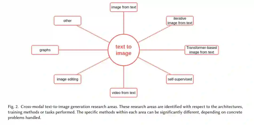 更具体地说,我们考虑了2016年至2022年的时间段内发表的论文 - 在撰写时刻的最新出版年份。我们已经在会议论文集中搜索了以下术语:跨模态,多模态,生成和扩散。根据符合这些标准的论文,我们选择了那些实际涵盖文本到图像生成的论文。我们还添加了一些不符合概述搜索标准但仍然与文本到图像生成相关的论文,特别是关于文本到图像扩散模型的工作。我们努力提供对跨模态文本到图像生成的全面回顾,重点关注各种方法的共同要素以及它们的独特特性。涵盖的主题概述如图2所示。 本次回顾的流程结构如下。在第2节中,描述了文本到图像生成问题,详细讨论了与此任务相关的子领域。特别是,第2.1节涵盖了从文本生成图像,第2.2节讨论了标准方法的迭代扩展,第2.3节聚焦于基于Transformer的变种,第2.4节描述了自监督方法,第2.5节强调了从文本输入生成视频的可能性,第2.6节处理了根据描述编辑图像的任务,第2.7节考虑了图方法,而第2.8节回顾了剩余的特殊方法。在第3节中,讨论了未来研究的潜在方向。第4节总结。
