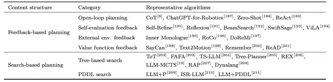 表 1 大模型驱动的具身感知算法总结大模型驱动的具身任务规划在大规模语言数据中训练得到的大模型对现实世界有着丰富的先验知识,可以用来作为具身智能任务的规划器。然而,大模型的知识与具身环境存在不匹配的现象,可能会导致大模型的规划无法执行。1)现有研究通过构建闭环反馈的方法来解决开环规划中存在的问题,包括大模型自我反馈、外部环境反馈、强化学习反馈等,对大模型等规划进行纠错,如图 4 所示。2)通过规划搜索算法能够提升大模型在长周期任务规划中的最优性,这一领域包含蒙特卡洛树搜索、世界模型、规划领域定义语言搜索等。该领域典型方法如表 2 所示。