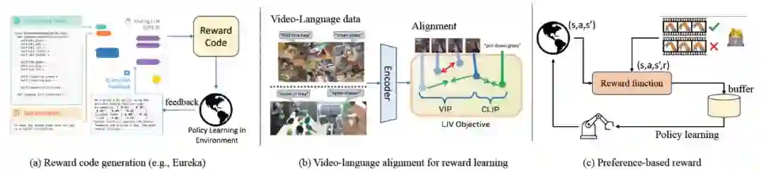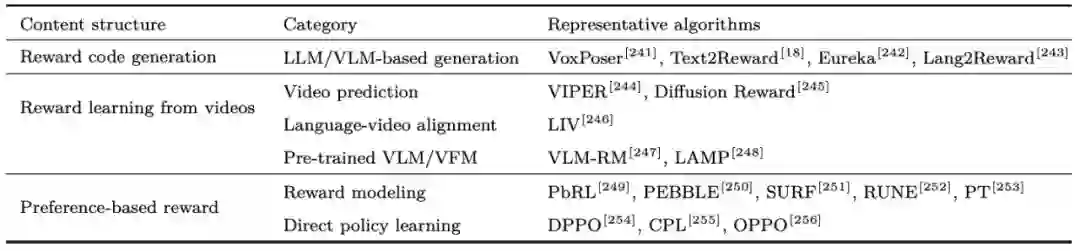 表 3 大模型具身基础策略算法总结大模型驱动的具身奖励函数在基于强化学习和模型规划控制的具身算法中,最优策略通过优化奖励函数产生。传统方法中奖励函数由机器人领域专家设计,具有一定的设计难度。1)大模型对机器人和任务具有丰富的先验知识,许多研究提出使用大语言模型 / 视觉语言模型进行奖励图或奖励函数的生成,随后通过策略优化和环境反馈进行优化。2)其他研究学习通过从状态视频预测、描述 - 轨迹匹配程度、轨迹相似性等方面学习参数化的奖励模型。3)受大模型偏好学习等启发,许多研究通过人类反馈对轨迹偏好进行打分,使用人类反馈强化学习(RLHF)算法进行奖励模型等训练。典型框架如图 6 和表 4 所示。
