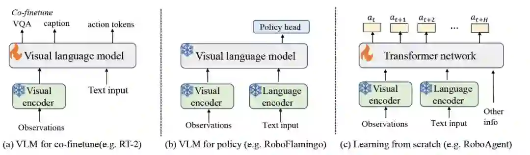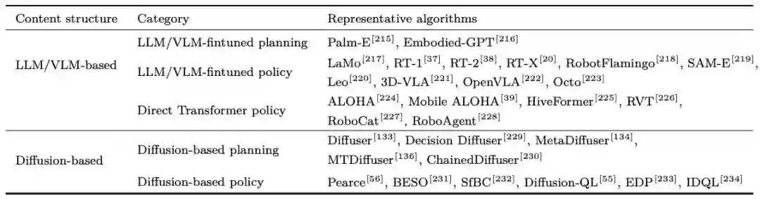 表 2 大模型驱动的具身规划算法总结大模型驱动的具身基础策略大模型任务规划依赖于能够执行规划对底层技能库。为了减轻底层技能库定义的依赖,提升决策效率,1)许多研究考虑将大模型参数作为具身基础策略,并利用具身数据对大模型参数进行微调,使大模型能够更加适应于具身决策场景。基础策略可以输出更具体的任务规划,也可以直接输出机器人需要执行的动作,如图 5 所示。2)扩散模型由于对长序列数据建模中的强大能力,许多研究将其用于建模专家轨迹的多样化数据分布,从而用于长序列任务的轨迹规划或动作规划,或作为具身策略结合强化学习算法进行策略优化。