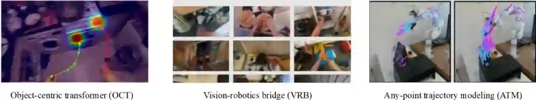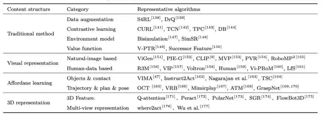 图 2 综述整体框架大模型驱动的具身环境感知在具身智能任务中,智能光电设备可以为具身智能体提供周围环境的视觉信号,随后大模型感知技术为具身决策提供基础。1)相比于传统的特征提取方法,视觉大模型具有较好的泛化性,许多研究通过引入视觉预训练模型来提高策略的视觉泛化能力和鲁棒性。2)机器人 Affordance 是一种对操作任务更具有解释性的通用特性,通过预训练 Affordance 模型能够为具身操作提供更详细的指导,例如物体的交互位置 (如门把手,茶壶手柄等),物体的交互轨迹 (如向内推、向上提等),如图 3 所示。3)复杂任务需要获取操作物体的 3D 场景特征,许多方法设计从点云和多视角图像中提取目标位置、方向、遮挡、物体之间的堆叠关系等。该领域典型方法如表 1 所示。