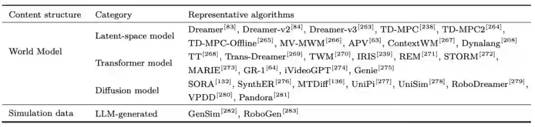 表 4 大模型驱动的具身奖励函数算法总结大模型驱动的具身数据生成大模型进行具身数据生成有望解决机器人数据稀缺的难题。1)世界模型(World Model)揭示了物理世界的运行规律,包括未来视觉观测如何改变,状态如何根据环境动力学进行转移,以及智能体最终达到的状态等。构建世界模型能够快速产生大量轨迹来丰富强化学习或模仿学习的数据,基本框架包含隐空间世界模型、Transformer 世界模型、扩散世界模型等。2)大模型能够借助仿真环境进行自动化的环境生成和数据采集,主要流程包括大模型自动任务提出、自动环境构造、自动任务解决、自动数据采集、自动技能学习等,快速产生针对特定任务的仿真数据,进行机器人技能和策略的学习,如图 7 所示。该领域典型方法如表 5 所示。
