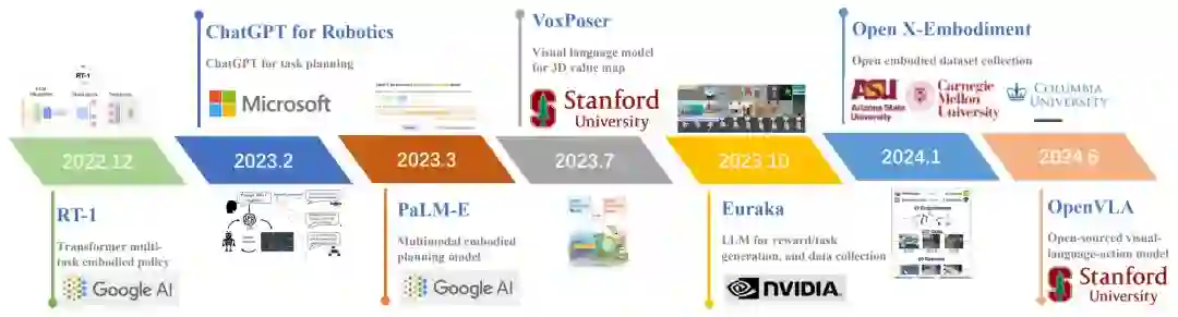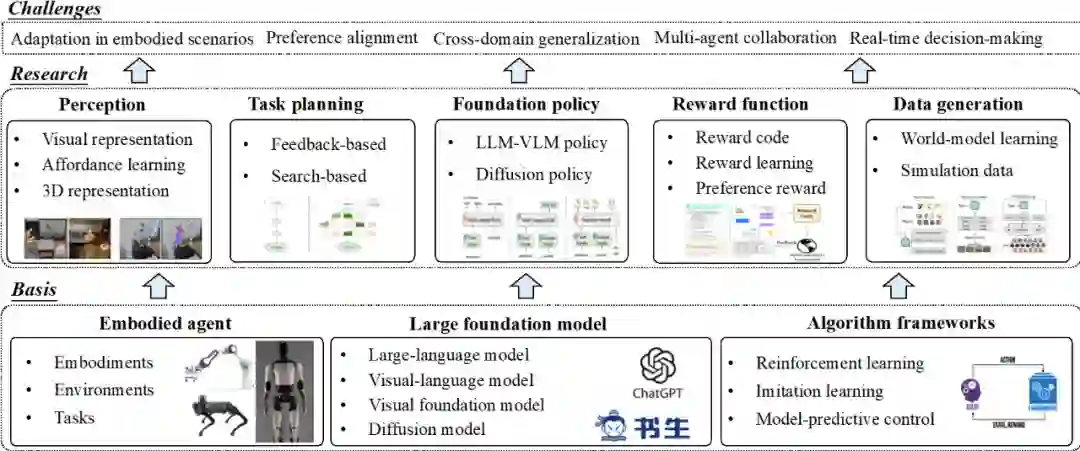 图 1 领域典型进展综述首先介绍相关技术背景,包括具身智能的基本概念,大模型相关技术,以及强化学习、模仿学习、模型预测控制等策略学习框架。随后,从学习范式的角度将大模型驱动的具身智能算法概括了五大类并依次进行了详细阐述,分别是大模型驱动的环境感知、大模型驱动的任务规划、大模型驱动的基础策略、大模型驱动的奖励函数、大模型驱动的数据生成。图 2 展示了综述的整体框架。