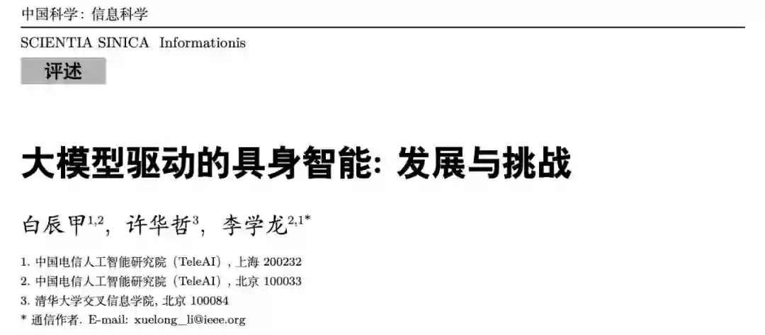 转载“机器之心”近年来,大模型在人工智能领域掀起了一场革命,各种文本、图像、多模态大模型层出不穷,已经深深地改变了人们的工作和生活方式。另一方面,在国际半导体大会上,英伟达创始人黄仁勋表示,人工智能下一个浪潮将是 “具身智能”,即能理解、推理、并与物理世界互动的智能系统。近年来,国内外商业巨头也纷纷推出自己的具身机器人发展计划。大模型和具身智能,无疑是当前人工智能领域最闪耀的双子星。在光电感知技术、机器人技术、大模型技术的快速发展下,大模型驱动的具身智能,不仅有望极大提升机器人的智能水平,更将推动人工智能技术迈向物理世界,从而产生更加广泛的应用。在此背景下,中国电信 CTO、首席科学家李学龙教授牵头组建中国电信人工智能研究院 (TeleAI), 并将大模型和具身智能作为重要的研究方向。近期,由 TeleAI 研究科学家白辰甲、清华大学助理教授许华哲、TeleAI 院长李学龙教授共同撰写的中文综述**《大模型驱动的具身智能:发展与挑战》**一文在《中国科学:信息科学》发表,综述通过对 300 篇相关文献的分类和解读,深度剖析大模型驱动的具身智能的基本概念、技术框架、现有挑战和未来展望,梳理这一热点问题背后的研究脉络和技术体系,进一步推动具身智能领域的发展,助力国家人工智能发展战略。