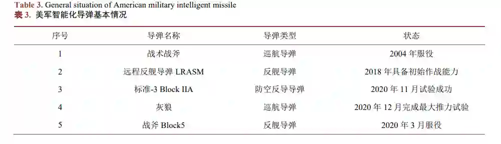 人工智能武器应当具有机智的决策、理性的辨别目标能力,具有明辨自然语言的能力,是一种能够 对外部环境具有极强的洞察力、实时应对各种复杂挑战,能认知会思考的武器系统[32]。科技发展至今, 利用人工智能技术的智能武器装备也在不断研制和应用,例如,目前美国的联合全域指挥控制系统 (JADC2)正处在研发阶段,根据五角大楼的最新规划,现代军队总参谋部的每一个组成部分,包括作战计 划、信息采集、情报收集、后勤与保障、通信和决策都将移交给由传感器、计算机和软件、算法和模型 组成的复杂集合体负责。所有这些组成部分随后都会被整合进一个“综合各个系统的系统”。最终,这 种多系统集合体可能会代替人类的职能,甚至超越人类所应承担的职能,以此来代替美军高级将领及其 资深参谋所承担的大部分职能。如图 11 所示。除了 JADC2 外,美军在役或在研的智能化导弹主要有战术战斧、远程反舰导弹(LRASM)、标准-3、 灰狼等,它们都是运用人工智能技术的产物,将人工智能技术应用到导弹中,使得智能导弹具备自主识 别目标和自主攻击的能力。以下是不同的智能化导弹、类型和状态的基本情况,如表 3 所示。在分布式作战和蜂群作战方面,2020 年 9 月,俄罗斯军方采用苏-57 战斗机进行试验,在真实作战 条件下,利用一架苏-57 战斗机作为指挥和控制多架苏-35 战斗机,执行协同攻击任务。美国军方也正在 利用新型 F-35 战斗机进行类似的分布式作战或蜂群作战试验。另外,灰狼巡航导弹试验成功也将具备蜂 群攻击的能力。不过,无论是分布式作战,还是蜂群作战,目前还处于初级试验阶段。其核心是先进的 算法模型和合理的数据以及高效的运算能力,因此还需要不断探究。