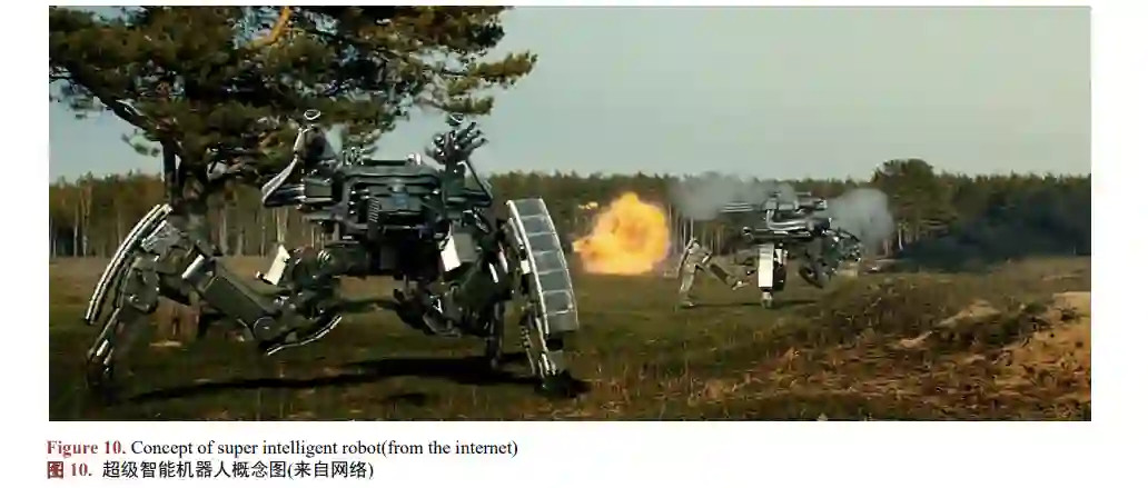作战机器人作为未来战争的主力军,是拥有人类智慧的参战者,从作战指挥到协同推进,从物质运 输到侦查勘探以及实战进攻都扮演着重要的角色,必须具备自我认知与推理能力、定量或定性空间表示、 知识表示、智能规划、感知与认知能力等。如图 10 所示。图 10 为作战机器人的概念图,环境为地面作战,要求机器人之间协同配合,精准识别目标,对目标 进行精准打击,这就需要机器人获取外界信息和高效计算的能力,智能控制能力等。除了上述的作战场 景的之外,智能作战无人机、水下智能机器人、空间智能机器人等都可以在复杂不确定的环境下参与作 战。作战机器人技术主要包含以下方面。一是如何赋予机器人人的的智慧或者超越人的智慧。复杂的作战环境下,要求机器人必须要有人的 感知能力、认知能力、创造力,机器人的灵活性和灵敏性必须能够达到人的灵活性和灵敏性,应当具备 群体智能的能力。二是作战机器人自我隐蔽技术。战争状态下,要求作战机器人要具有极强的隐蔽性,动作灵活,特 别是侦查机器人,不能够发出噪声。三是作战机器人超长待机技术。战场中环境复杂多变,机器人必须保证自己的能量不受威胁,长期 作战情况下,机器人要具有获取能量自我补充的能力。四是人工智能芯片技术。作战机器人的智能芯片有待发展,智能芯片作为机器人的核心部分,需要 具备更加完备的能力。将人工智能技术应用到作战机器人已成为该领域研究的一大方向。