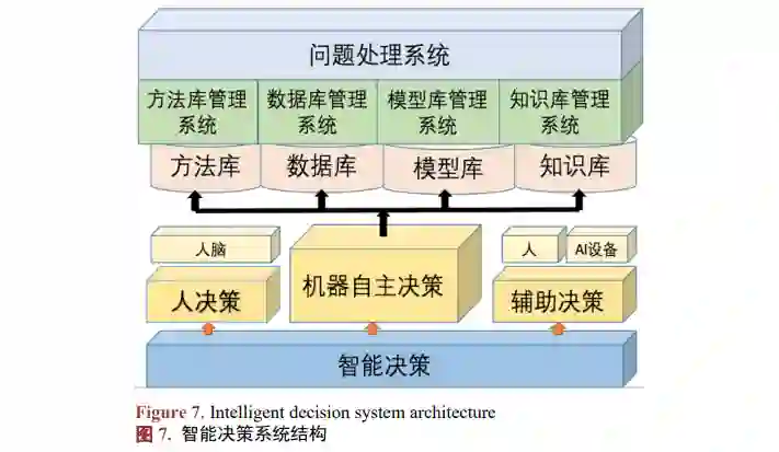 未来战场必将是智能化的战场,智能决策在智能武器装备中起着关键性的作用。智能决策主要分为 3 个层次:人来决策、辅助决策、机器自主决策。人来决策的主体是人,战时状态下,通过远程操控, 由人来做出决策。辅助决策是人通过借助外在智能设备做出科学决策。最理想的状态是机器能够像人一 样的智能甚至超越人的智能做出精准、高效、合理的决策。借助人工智能技术使得机器自主决策是智能 决策研究的重要方向之一。智能决策系统结构如图 7 所示。