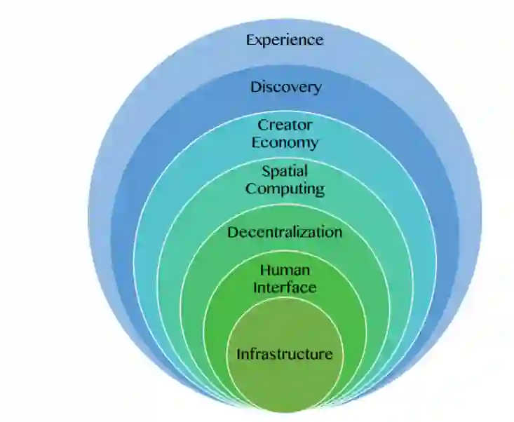 **元宇宙并不是一个新概念,因为它已经随着互联网和其他技术的发展流传了几十年。图2描述了包含许多主要事件的元宇宙发展的时间线,从互联网的诞生和第一次在文学中提及到第一个虚拟世界项目的第二人生和最近的大型科技公司如微软和Facebook的元宇宙项目。**Metaverse这个词由Meta和Universe[2]组合而成,最早出现在1992年的反乌托邦赛博朋克小说《雪撞》中,用来描述一个名为matrix的虚拟现实世界。目前,元宇宙被定义为一个共享的虚拟3D世界,甚至多个跨平台的世界,可以通过交互和协作活动为用户提供全面的沉浸式体验。除了固定在虚拟世界中的虚拟场所和建筑外,许多其他实体,如物品、用户身份、数字商品等,都可以在不同的虚拟世界之间交换,甚至反映到现实世界[3]中。近年来,元宇宙出现了前所未有的爆炸式增长,主要源自3D游戏,硬件(如大数据存储基础设施、无线通信网络、内置传感器和图形处理单元- GPU)的改进和软件(如:在通信、语言处理和计算机视觉方面的资源分配),以更坚实和创造性地构建虚拟世界。与传统的元宇宙模式因数据不足而严重限制沉浸式体验不同,新元宇宙模式不仅为企业(用户可以自由创作创意内容)产生了巨大的用户和行为数据新来源,而且为人工智能(AI)在各个领域的部署提供了丰富的基础,比如自然语言处理、计算机视觉和神经接口。此外,为现代元宇宙构建的标准平台应该满足以下特征: 虚拟世界、持久性、可扩展性、始终同步、财政支持、去中心化、安全性和互操作性。在[4]中,一个元宇宙可以包含几个层(如图3所示),其表达式如下: