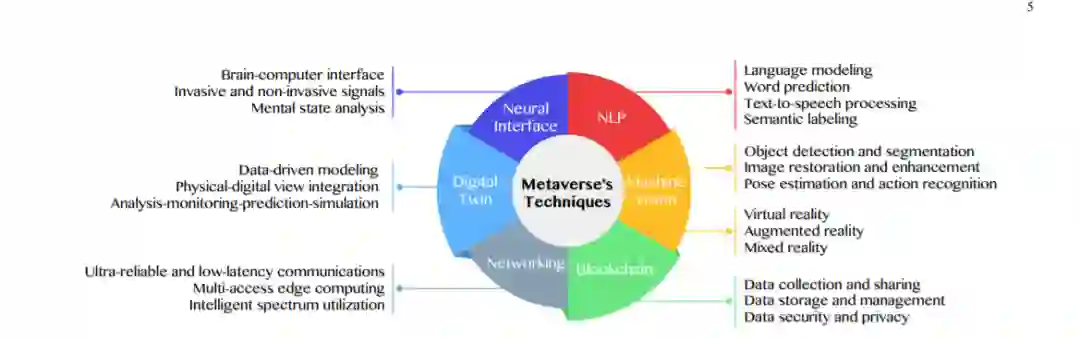 我们在6个技术方面考察了最先进的人工智能技术,包括自然语言处理、机器视觉、区块链、网络、数字孪生(DT)和神经接口,显示了元世界平台的巨大潜力。