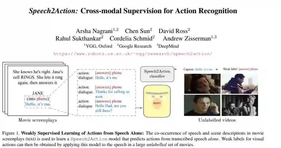 仅凭对话就能猜测人类行为吗?在这项工作中,我们调查了电影中的言语和动作之间的联系。我们注意到,电影剧本描述动作,也包含角色的语言,因此可以用来学习这种相关性,而不需要额外的监督。我们在一千多部电影剧本中训练一个基于BERT的语音动作分类器,从转录的语音片段中预测动作标签。然后,我们将该模型应用于一个大型未标记电影语料库的语音片段(来自288K电影的1.88亿个语音片段)。利用该模型的预测,我们得到了800K以上视频片段的弱动作标签。通过对这些视频剪辑的训练,我们在标准动作识别基准上展示了优越的动作识别性能,而无需使用一个手动标记的动作示例。