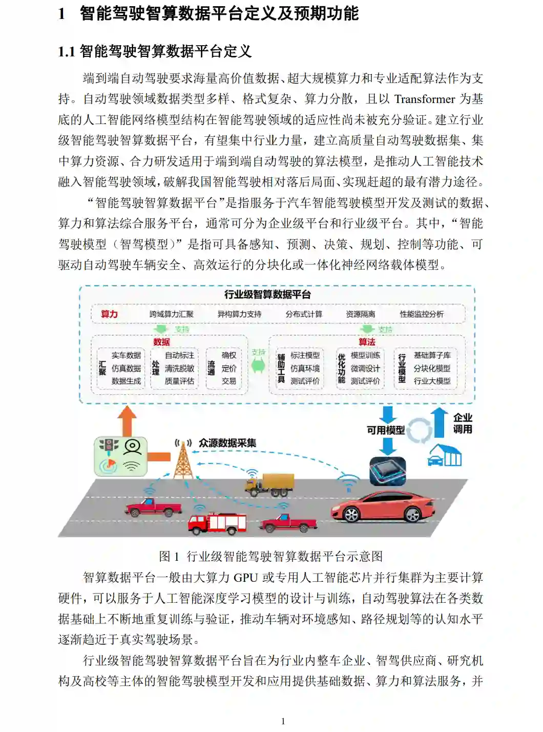 智能驾驶智算数据平台定义 端到端自动驾驶要求海量高价值数据、超大规模算力和专业适配算法作为支持。自动驾驶领域数据类型多样、格式复杂、算力分散,且以Transformer为基底的人工智能网络模型结构在智能驾驶领域的适应性尚未被充分验证。建立行业级智能驾驶智算数据平台,有望集中行业力量,建立高质量自动驾驶数据集、集中算力资源、合力研发适用于端到端自动驾驶的算法模型,是推动人工智能技术融入智能驾驶领域,破解我国智能驾驶相对落后局面、实现赶超的最有潜力途径。“智能驾驶智算数据平台”是指服务于汽车智能驾驶模型开发及测试的数据、算力和算法综合服务平台,通常可分为企业级平台和行业级平台。其中,“智能驾驶模型(智驾模型)”是指可具备感知、预测、决策、规划、控制等功能、可驱动自动驾驶车辆安全、高效运行的分块化或一体化神经网络载体模型。