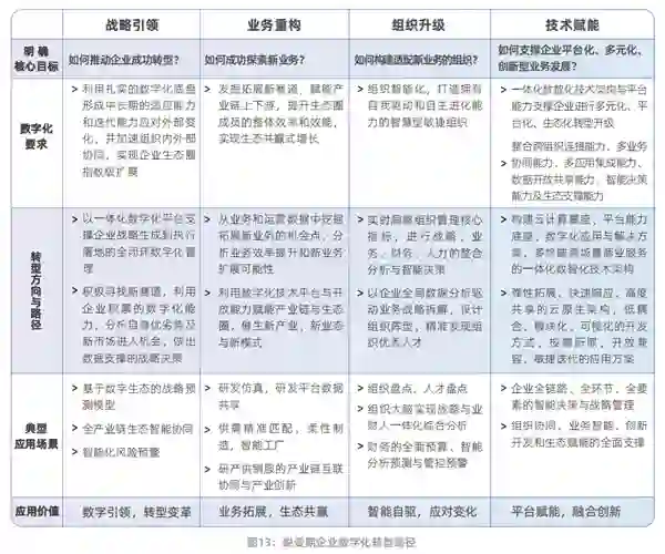 成熟期企业在整体规模与营收水平上均已实现突破,市场规模与占有率进一步稳步提升,盈利能力进一步加强。但伴随企业规模的不断增长,通常拥有更加复杂多元的业务模式和组织架构。此阶段企业的数字化建设可通过“前中后台”的架构进一步提升业务敏捷能力与组织治理能力,向全局智能化和产业链上下游协同升级演进,实现企业的全局数据智能和内外部网络协同。 大象跳舞:蜕变期数字化转型路径