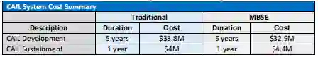 Team Time Zone进行了成本分析,以估计为DON实施CAIL系统的成本。该团队使用了两种方法来估计成本:传统的成本估计和基于模型的系统工程(MBSE)方法。该小组估计CAIL系统的成本(基于传统的成本估算)为3380万美元,持续时间为5年,每年的重复维持成本为400万美元。团队估算的CAIL系统成本(基于MBSE方法),在运行了一万次蒙特卡洛模拟后,平均为3290万美元,持续时间为5年。运营和维护模型的平均成本为每年440万美元。表1显示了CAIL开发和维护成本的摘要。
